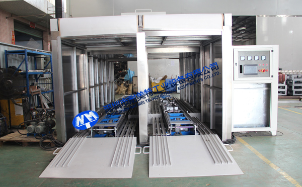 2、外形尺寸:寬4700*高2850*深13900mm,箱體內(nèi)可同時(shí)平排進(jìn)三臺(tái)推車,烘烤時(shí)間可獨(dú)立設(shè)置(見附圖);上料區(qū)長(zhǎng)1500mm,設(shè)有上料斜坡,便于推車進(jìn)入緩沖區(qū);兩端緩沖區(qū)各長(zhǎng)1700mm,各設(shè)有升降平臺(tái),便于推車進(jìn)出烘烤,爐蓋上加裝0.75KW高溫抽風(fēng)風(fēng)機(jī);烘干區(qū)長(zhǎng)7620mm,烘干區(qū)前后裝有隔熱卷閘門,加裝感應(yīng)器,底部設(shè)有傳送鏈條;下料區(qū)長(zhǎng)1500mm, 加裝斜坡 ,以便推車出料。